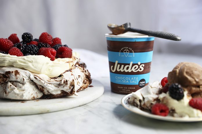 A delicious dessert for your table this Easter - Cocoa & Berry Pavlova with a scoop of Jude's Chocolate with a touch of Sea Salt ice...